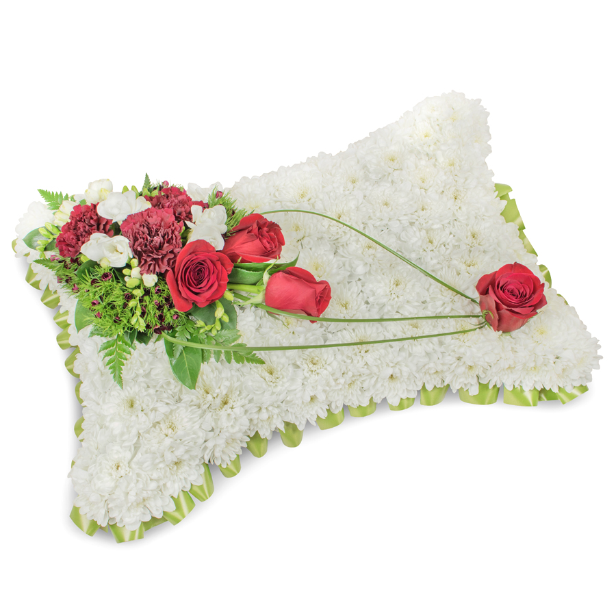 Convey your sympathies with our graceful condolence bouquet, featuring a refined selection of white chrysanthemums, vibrant red roses, sweet white freesias, and dark red carnations. Accentuated with dianthus and soft bear grass, this unique arrangement beautifully expresses your heartfelt message.